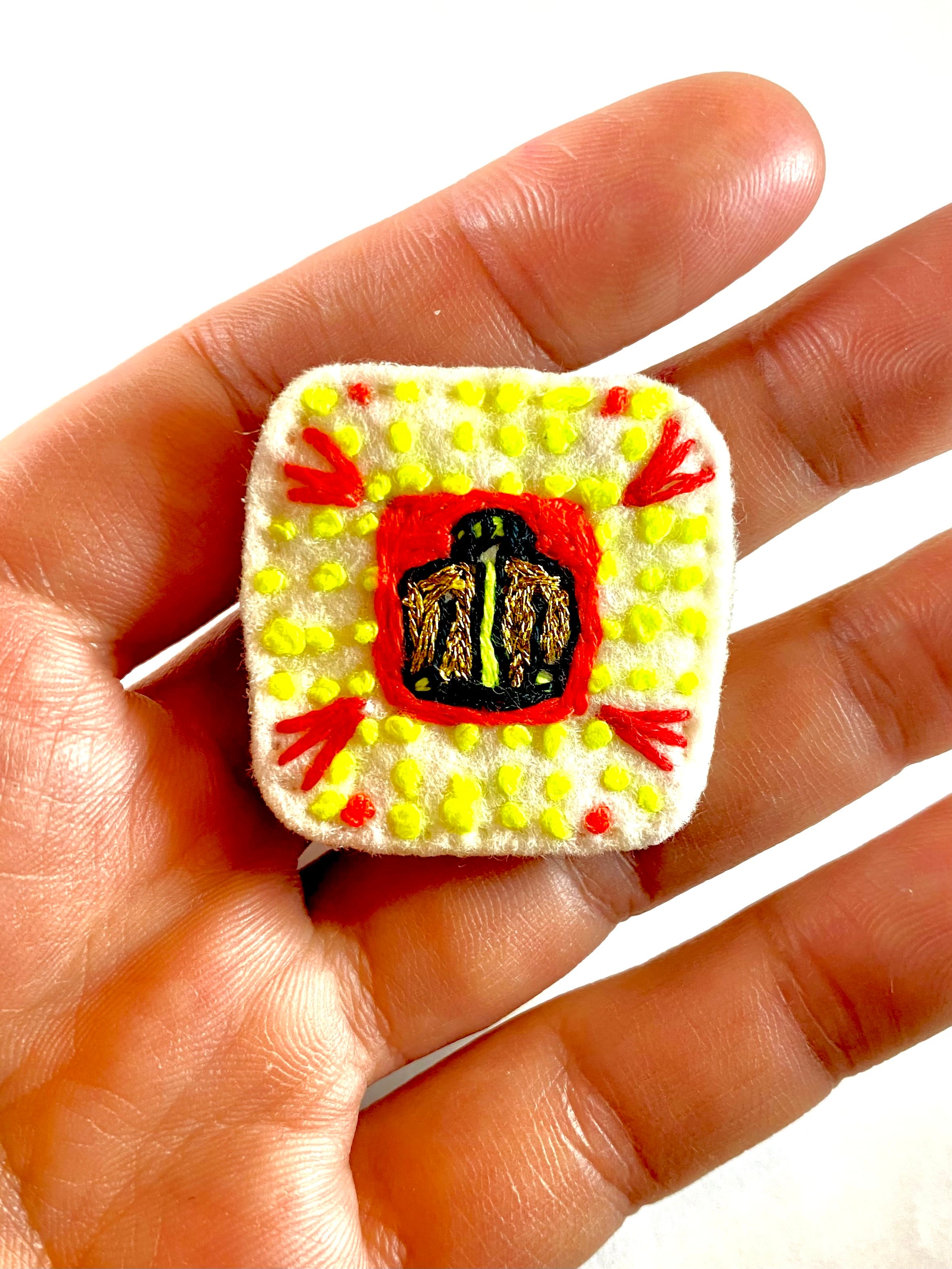 表はピュアホワイトのフェルトに蛍光イエローの刺繍糸でフレンチノット的なフレームをこしらえてみました。裏面はトレンドのキャメルに