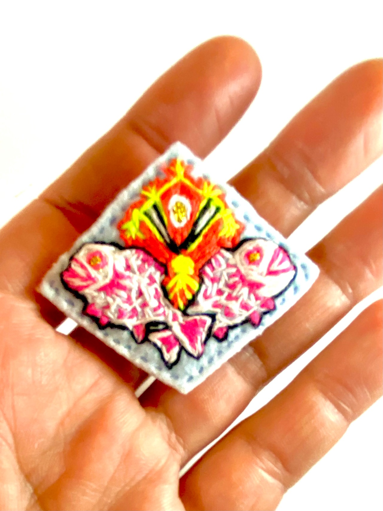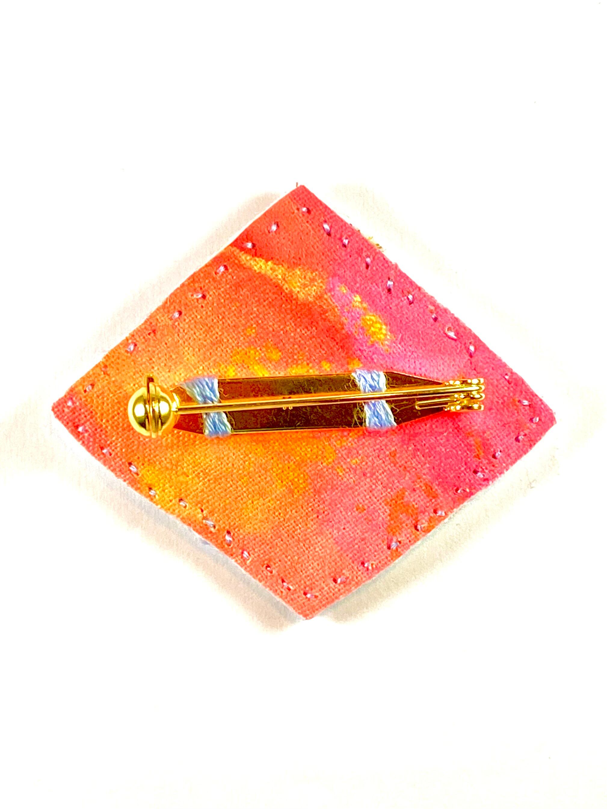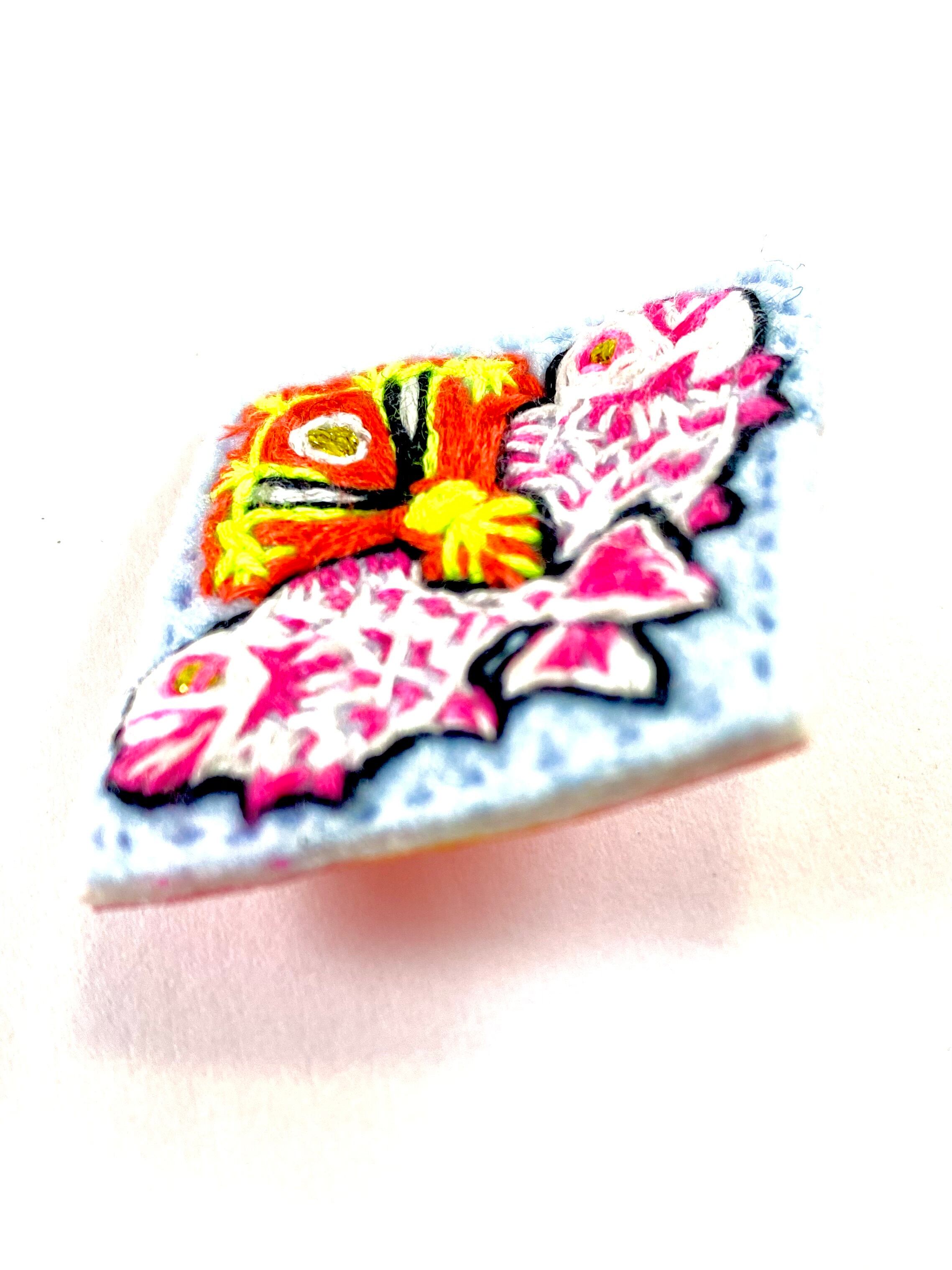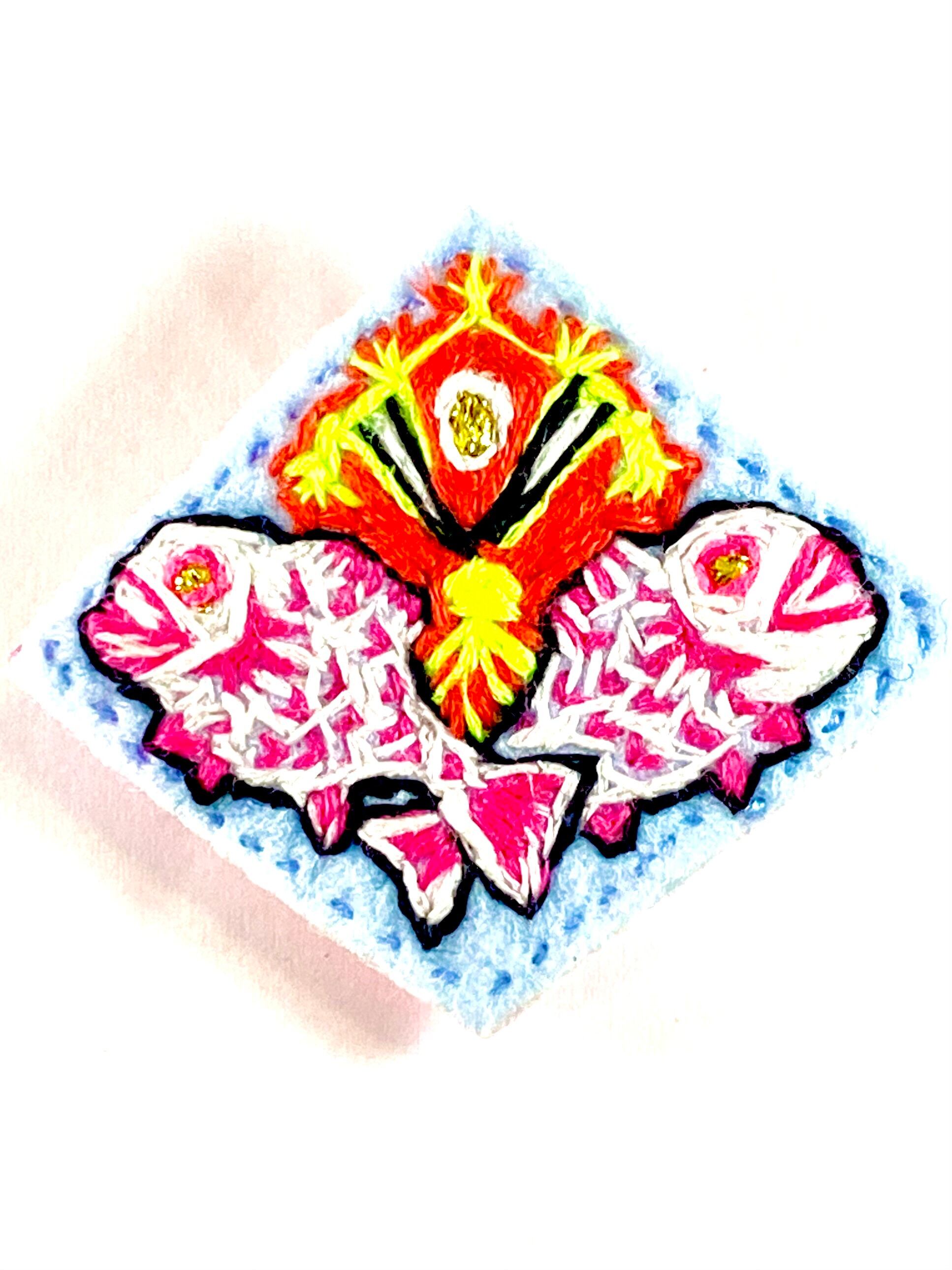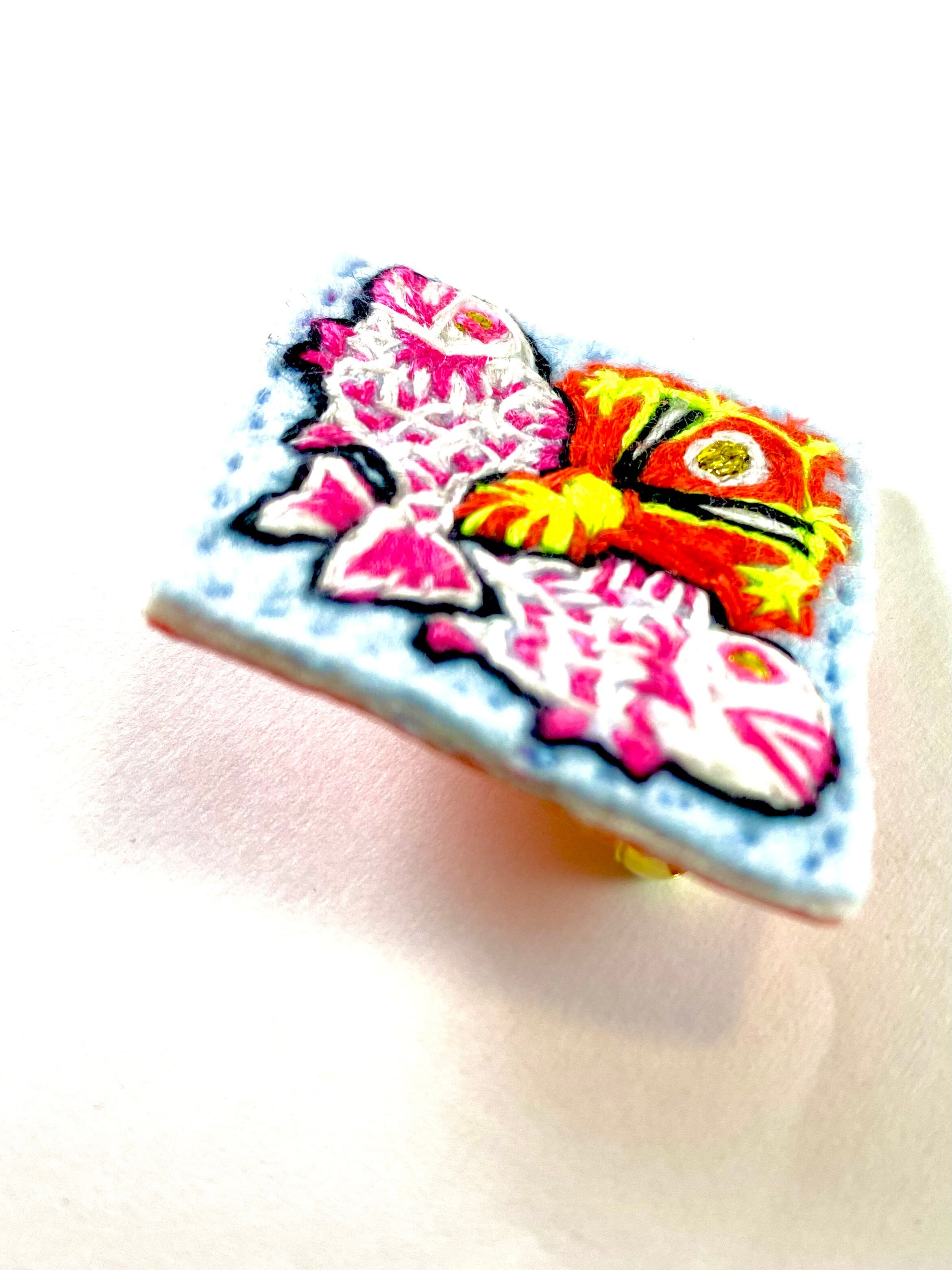 表はアイスブルーのフェルトにホワイトとスカーレットそしてネオンマゼンタの刺繍糸。裏面はネオンピンク→山吹色へのグラデーションで彩色したシーチング布でまとめた逸品です◎