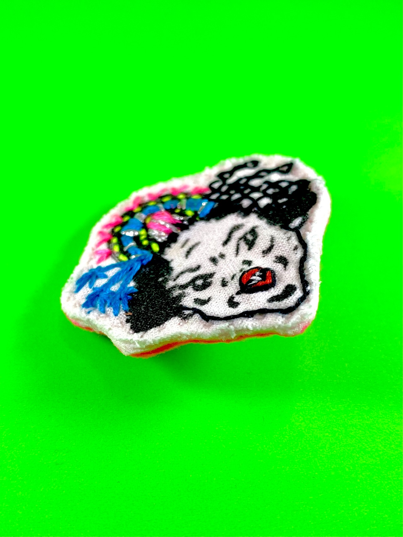 フェルトに手刺繍を施し接着芯を圧着して