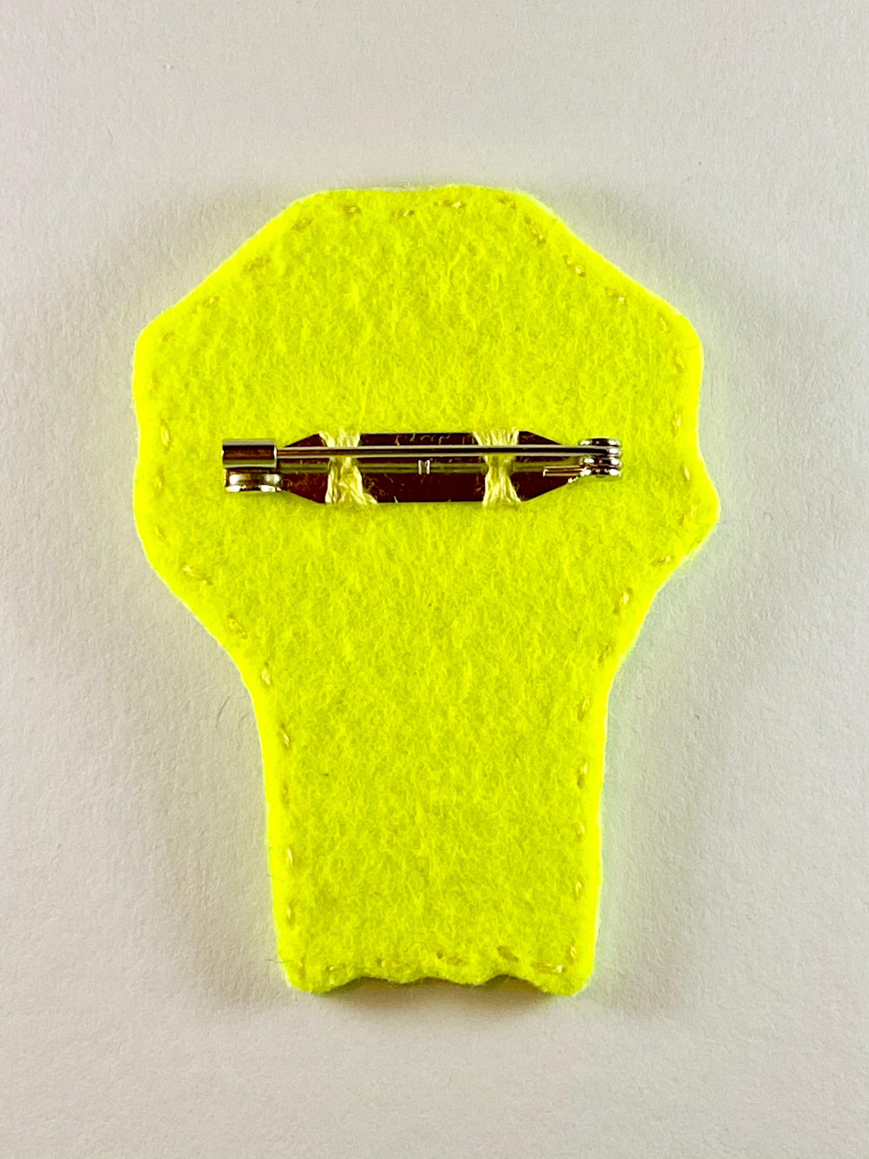 ロゼット風ブローチ。「喜ぶ」の文字が