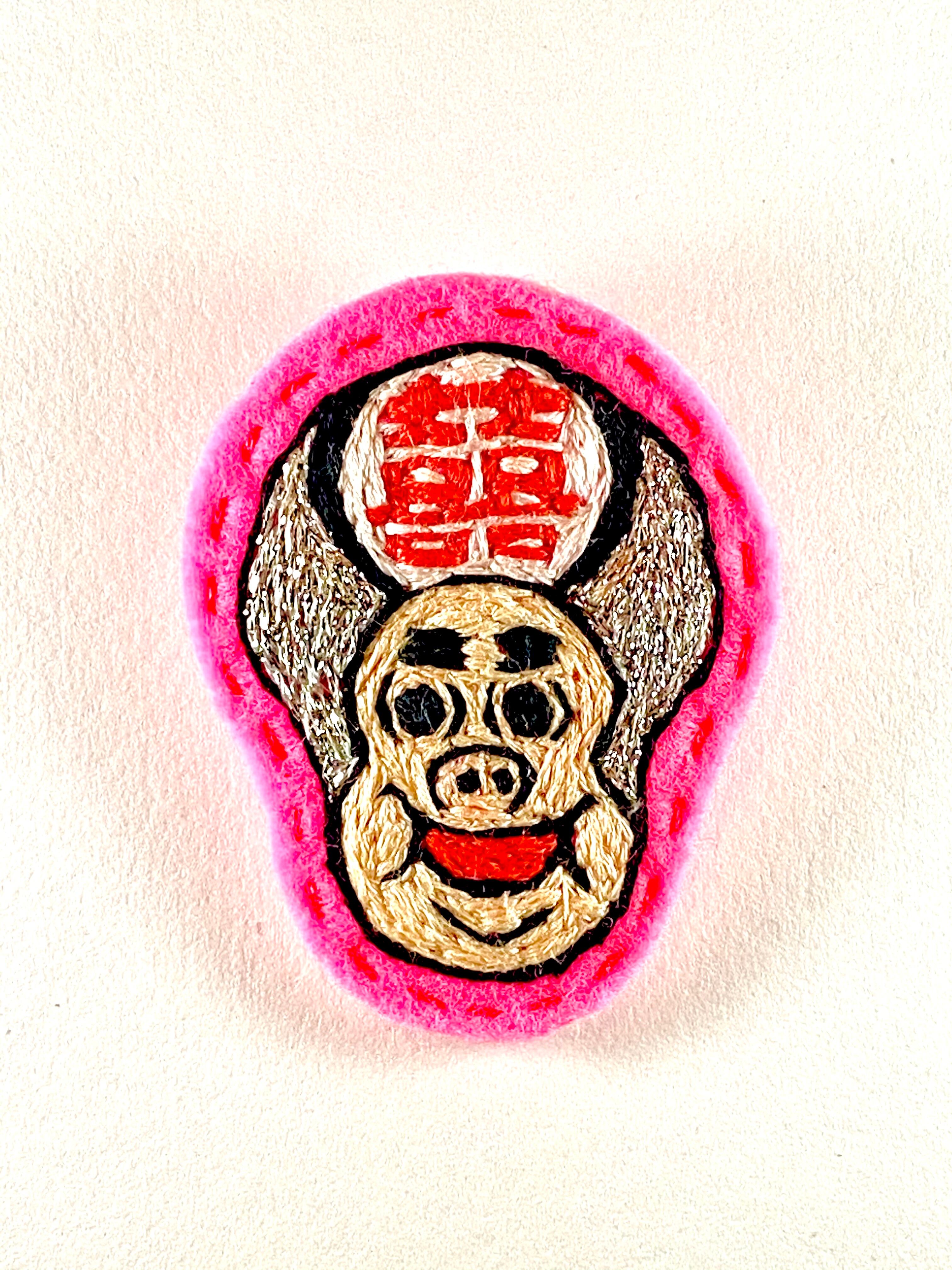 頭に幸運を呼ぶ「囍」の文字をあしらった